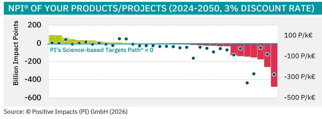 All impacts are first quantified — in absolute values, percentages, or Impact Points™ — and then translated into clear impact performance levels, making complex impact data understandable, actionable, and easy to benchmark.