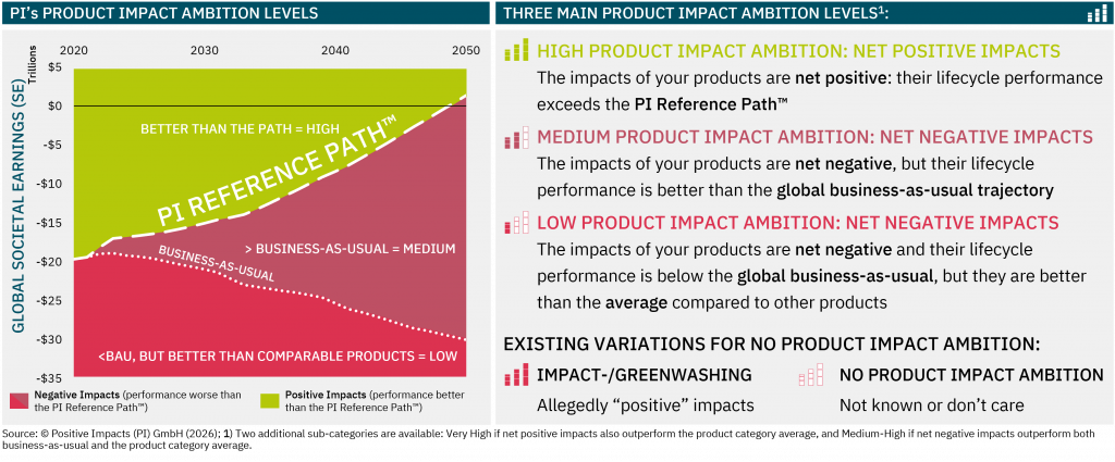 Three main Impact Ambition Levels:High Impact Ambition: your impacts are net positive and your performance exceeds the PI Reference Path™ (Very High: also outperforming the industry average).Medium Impact Ambition: your impacts are net negative, but your performance improves faster than the global business-as-usual trajectory (Medium-High: also outperforming the industry average).Low Impact Ambition: your impacts remain net negative and your performance is below the global business-as-usual trajectory, but still better than the sector average. Existing variations for no Impact Ambition:Impact-/Greenwashing: allegedly “positive” impacts.No Impact Ambition: impacts are not known or not considered.